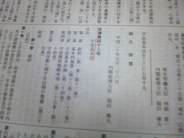 ←官報に載っていました。宇宙基本法。直前に舛添大臣の名前があるのは、介護保険法及び老人福祉法の改正。