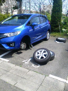 タイヤを交換しました。4階まで運ぶのは大変なので1日1本ずつ運ぶつもり。ひとまずクルマに積んであります。